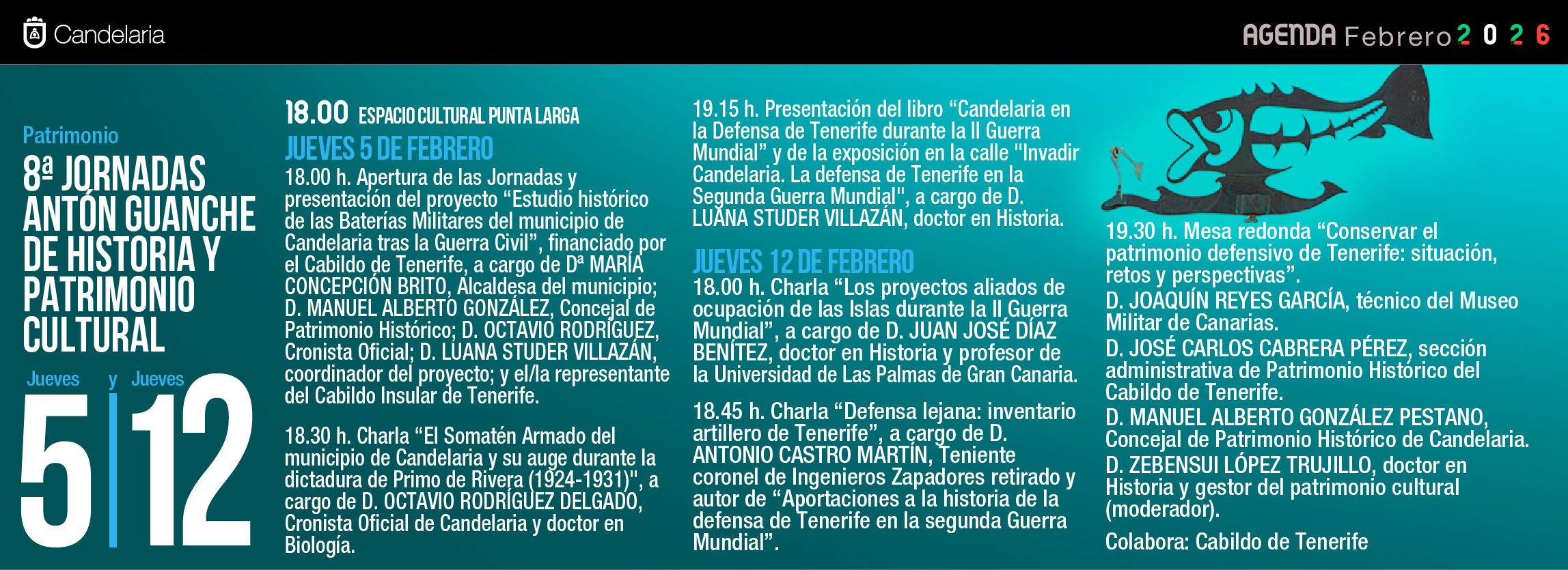 18.00 Espacio Cultural Punta Larga Jueves 5 de febrero 18.00 h. Apertura de las Jornadas y presentación del proyecto “Estudio histórico de las Baterías Militares del municipio de Candelaria tras la Guerra Civil”, financiado por el Cabildo de Tenerife, a Leer más...