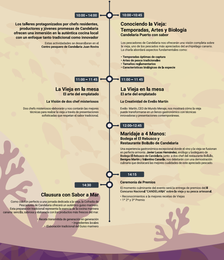 Este certamen reunirá a varios cocineros procedentes de distintos puntos del archipiélago, quienes competirán en la elaboración de platos innovadores con La Vieja como ingrediente principal, un pescado emblemático de la cocina canaria que representa no solo el sabor del Atlántico, sino también el compromiso con la tradición pesquera artesanal.