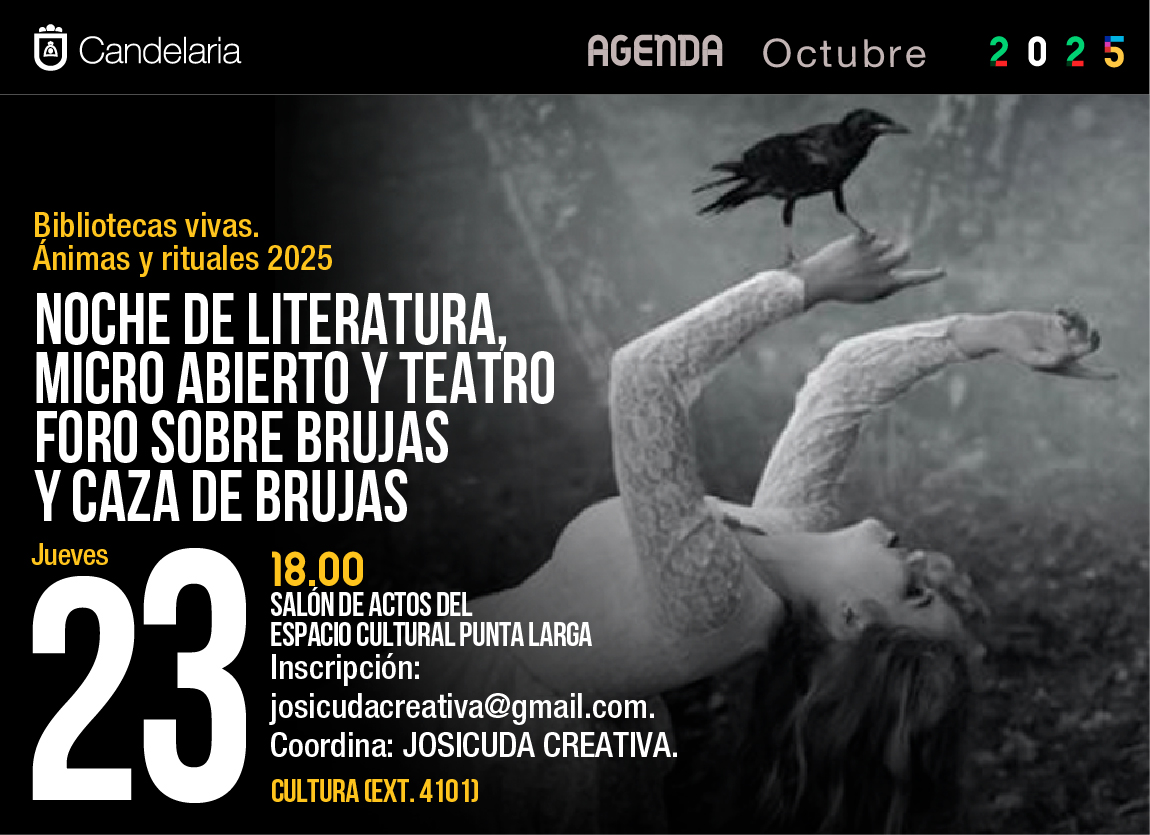 Esa línea temática continuará este jueves 23 de octubre, también a las 18.00 horas, con la “Noche de literatura, micro abierto y teatro: foro sobre brujas y caza de brujas”, en el Salón de Actos del Espacio Cultural Punta Larga, una actividad coordinada por Josicuda Creativa que combinará lectura, escena y reflexión colectiva sobre las figuras de las brujas en el imaginario cultural.