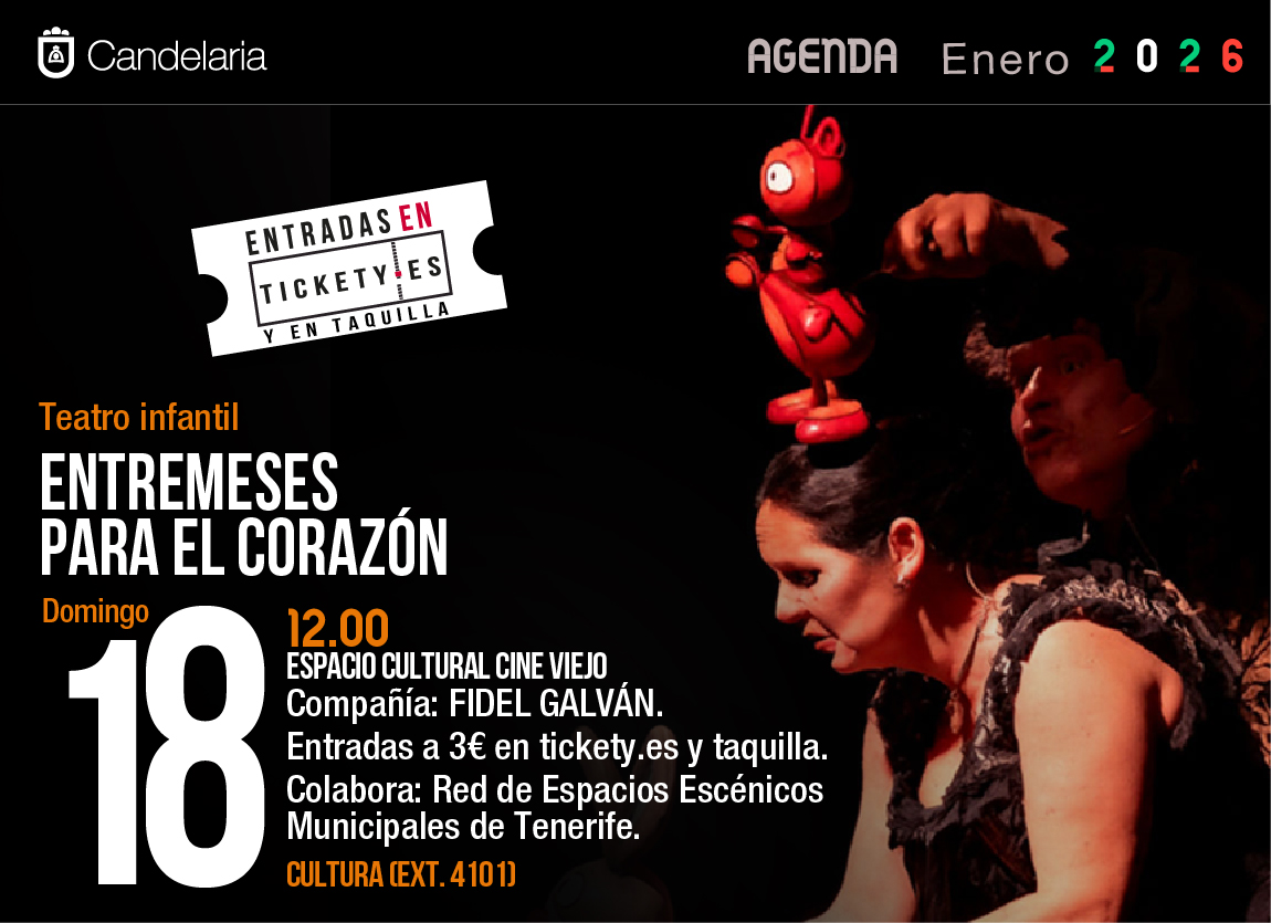 ENTREMESES PARA EL CORAZÓN Teatro infantil 12.00 ESPACIO CULTURAL CINE VIEJO Compañía: FIDEL GALVÁN. Entradas a 3€ en tickety.es y taquilla. Colabora: Red de Espacios Escénicos Municipales de Tenerife.