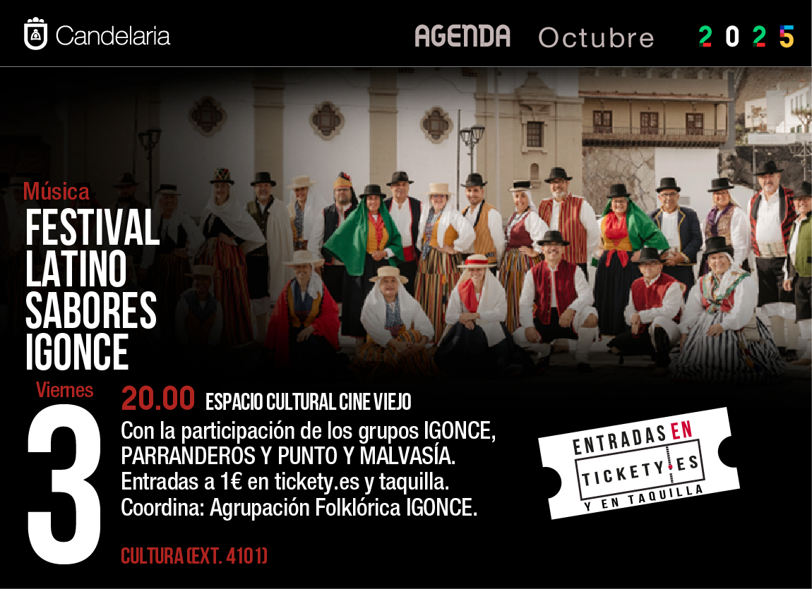 Festival Latino Sabores Igonce 20.00 ESPACIO CULTURAL CINE VIEJO Con la participación de los grupos IGONCE, PARRANDEROS Y PUNTO Y MALVASÍA. Entradas a 1€ en tickety.es y taquilla. Coordina: Agrupación Folklórica IGONCE.