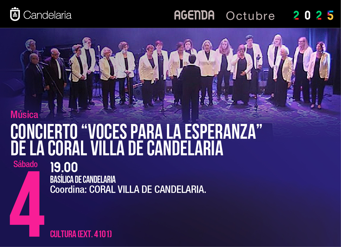 Concierto "Voces para la esperanza" de la Coral Villa de Candelaria 19.00 BASÍLICA DE CANDELARIA Coordina: CORAL VILLA DE CANDELARIA.