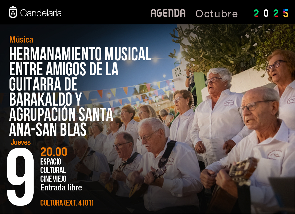 Hermanamiento musical entre Barakaldo y Agrupación Santa Ana- San Blas HERMANAMIENTO MUSICAL ENTRE AMIGOS DE LA GUITARRA DE BARAKALDO Y AGRUPACIÓN SANTA ANA-SAN BLAS 20.00 ESPACIO CULTURAL CINE VIEJO Entrada libre