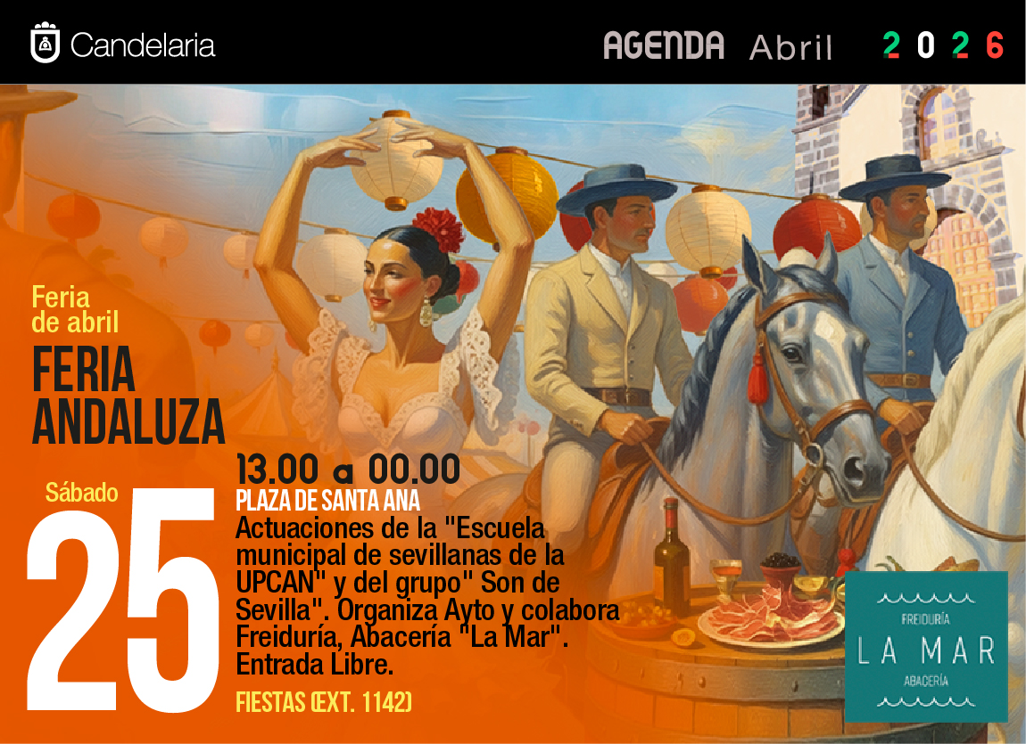13.00 a 00.00 PLAZA DE SANTA ANA Actuaciones de la "Escuela municipal de sevillanas de la UPCAN" y del grupo" Son de Sevilla". Organiza Ayto y colabora Freiduría, Abacería "La Mar". Entrada Libre.