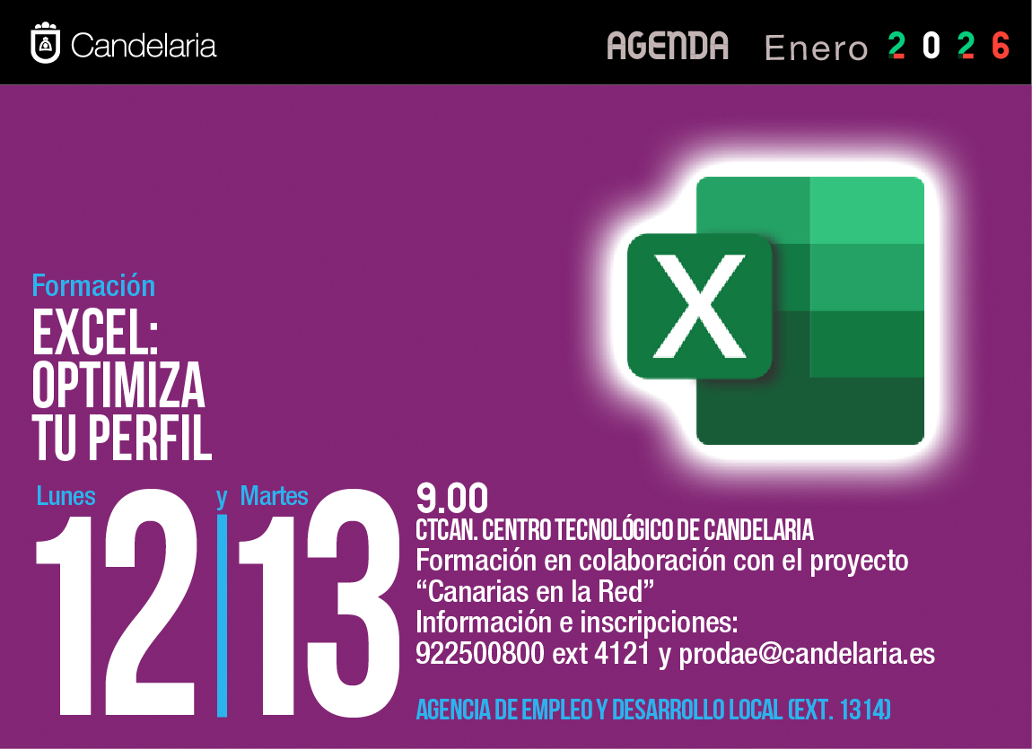 EXCEL: OPTIMIZA TU PERFIL Formación 9.00 CTCAN. CENTRO TECNOLÓGICO DE CANDELARIA Formación en colaboración con el proyecto “Canarias en la Red” Información e inscripciones: 922500800 ext 4121 y prodae@candelaria.es