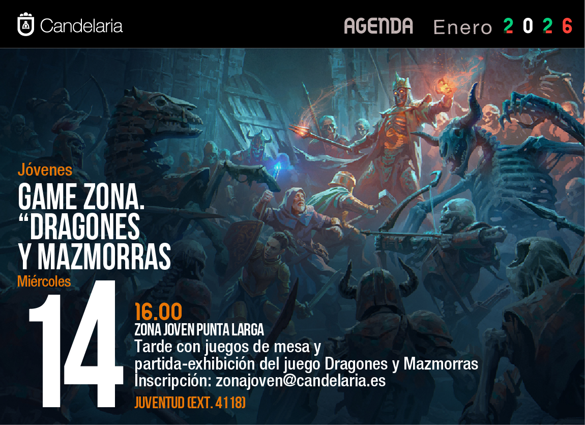GAME ZONA. “DRAGONES Y MAZMORRAS" Jóvenes 16.00 ZONA JOVEN PUNTA LARGA Tarde con juegos de mesa y partida-exhibición del juego Dragones y Mazmorras Inscripción: zonajoven@candelaria.es