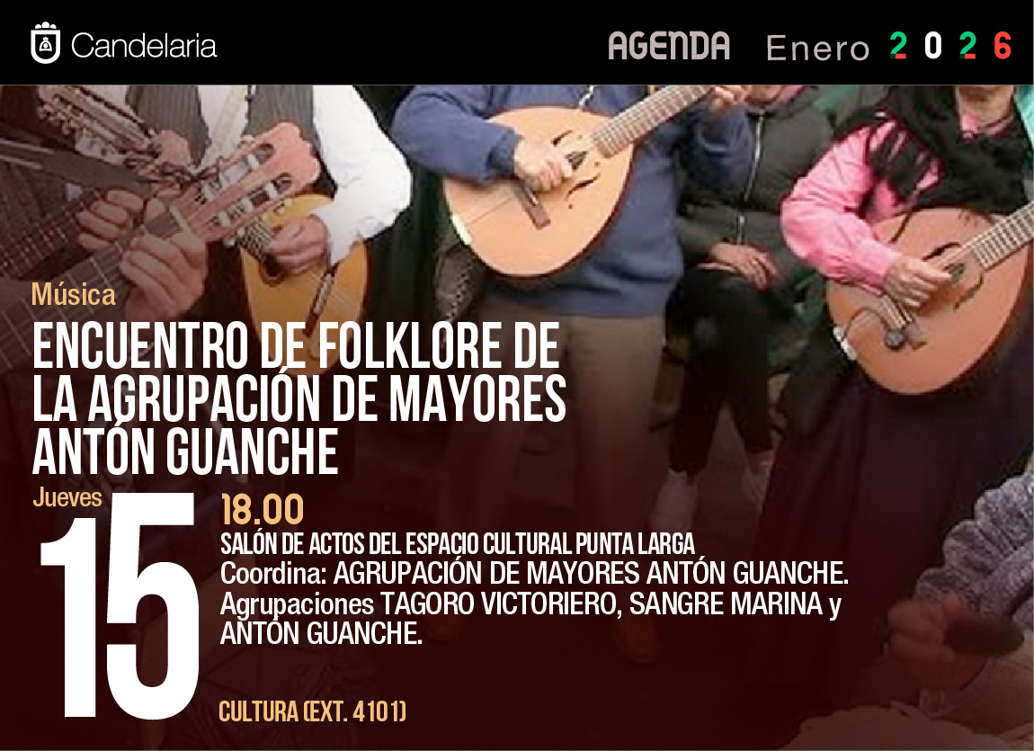 ENCUENTRO DE FOLKLORE DE LA AGRUPACIÓN DE MAYORES ANTÓN GUANCHE Música CULTURA (EXT. 4101) 18.00 SALÓN DE ACTOS DEL ESPACIO CULTURAL PUNTA LARGA Coordina: AGRUPACIÓN DE MAYORES ANTÓN GUANCHE. Agrupaciones TAGORO VICTORIERO, SANGRE MARINA y ANTÓN GUANCHE