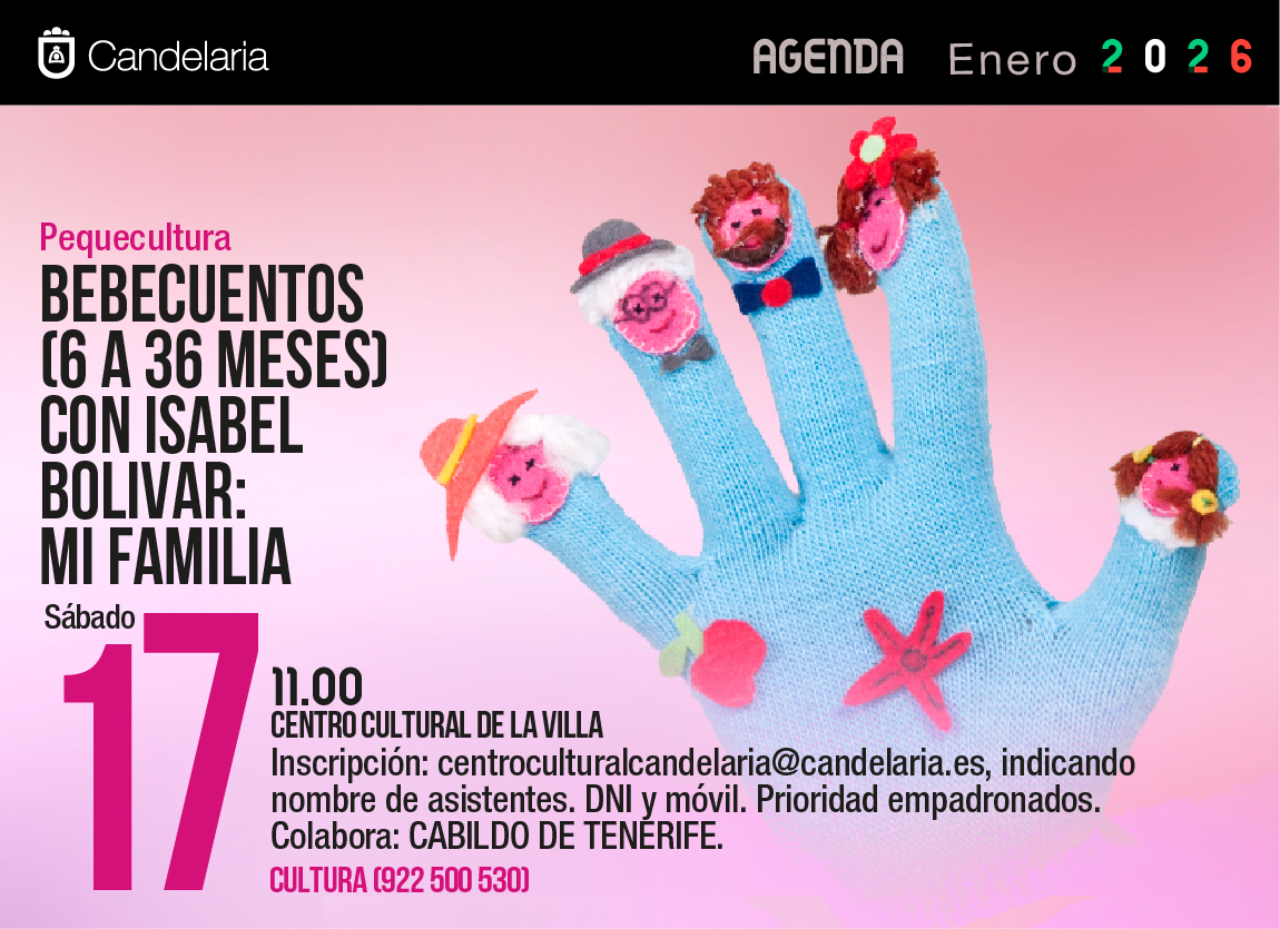 BEBECUENTOS (6 A 36 MESES) CON ISABEL BOLIVAR: MI FAMILIA Pequecultura CULTURA (922 500 530) Sábado 11.00 CENTRO CULTURAL DE LA VILLA Inscripción: centroculturalcandelaria@candelaria.es, indicando nombre de asistentes. DNI y móvil. Prioridad empadronados. Colabora: CABILDO DE TENERIFE.