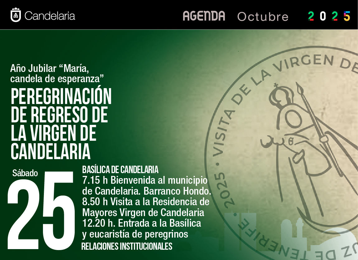 7.15 h Bienvenida al municipio de Candelaria. Barranco Hondo. 8.50 h Visita a la Residencia de Mayores Virgen de Candelaria 12.20 h. Entrada a la Basílica y eucaristía de peregrinos