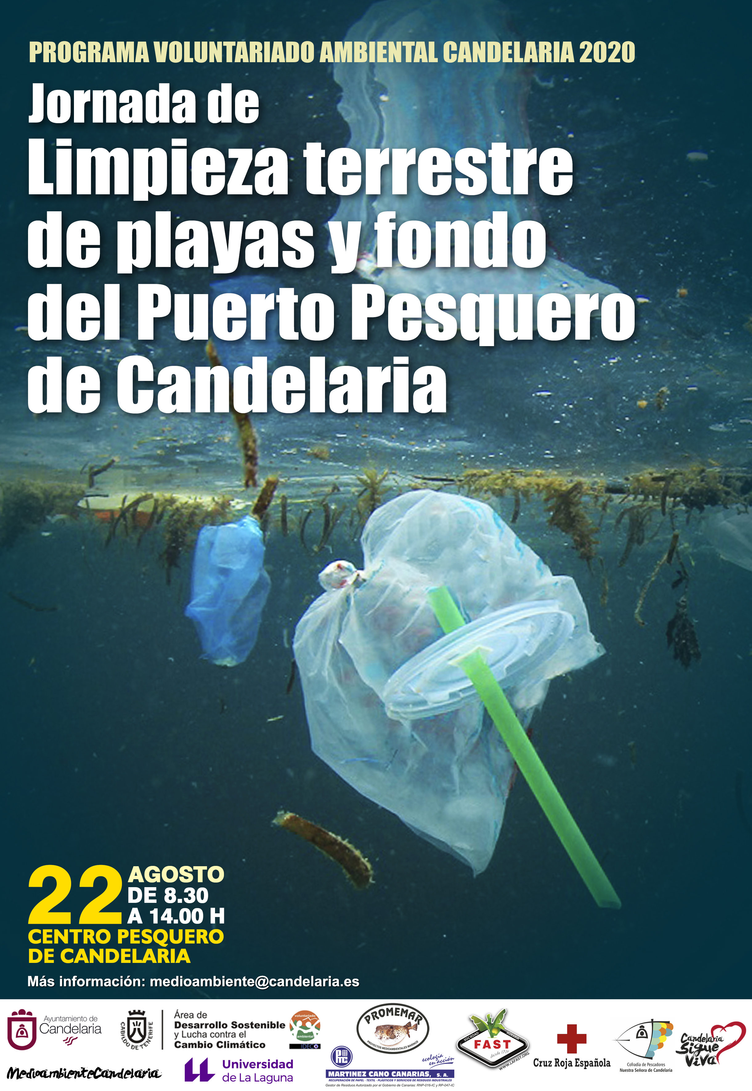 El Ayuntamiento de Candelaria, a través de la concejalía de Medioambiente Natural y el área de Desarrollo Sostenible y Lucha Contra el Cambio Climático de la Oficina de Voluntariado Ambiental del Cabildo de Tenerife, con el objetivo de concienciar de forma práctica y directa a la ciudadanía sobre la relevancia y la crucialidad de mantener las playas y los fondos marinos limpios, organiza, este 22 de agosto, una jornada de limpieza terrestre de playas y fondo del Puerto Pesquero de Candelaria, enclave histórico del municipio. Todo esto enmarcado dentro del Programa de Voluntariado Ambiental Candelaria 2020.