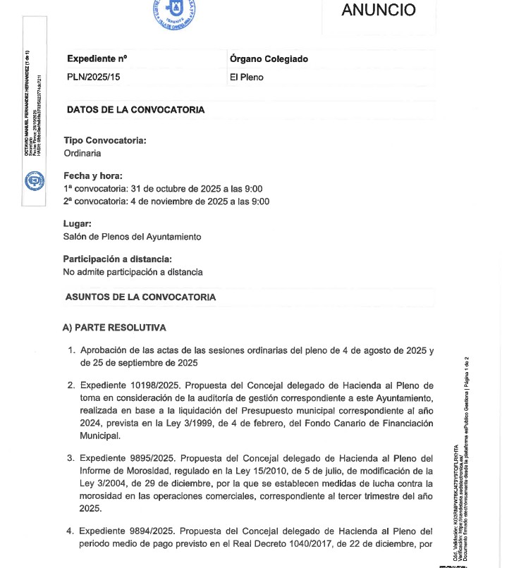 - Expediente 10198/2025. Propuesta del concejal delegado de Hacienda al Pleno de toma en consideración de la auditoría de gestión correspondiente a este Ayuntamiento, realizada en base a la liquidación del Presupuesto municipal correspondiente al año2024, prevista en la Ley 3/1999, de 4 de febrero, del Fondo Canario de Financiación Municipal.