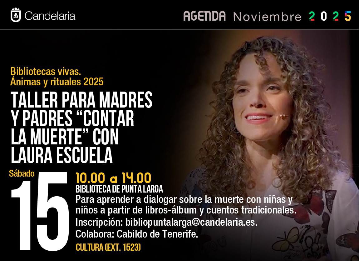 ✅ Taller para madres y padres: “Contar la muerte” con Laura Escuela 🕒 10:00–14:00📍 Biblioteca de Punta Larga📧 bibliopuntalarga@candelaria.esColabora: Cabildo de Tenerife📞 Cultura Ext. 1523