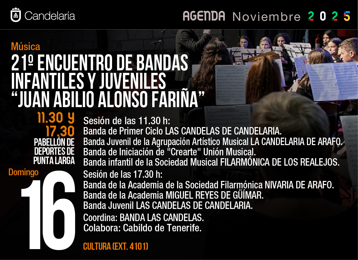 ✅ 21º Encuentro de Bandas Infantiles y Juveniles “Juan Abilio Alonso Fariña” 🕒 11:30–17:30📍 Plaza de Primer Chío Las Candelas de CandelariaParticipan bandas de Arafo, Candelaria, Arafo y Los Realejos.📞 Cultura Ext. 4101