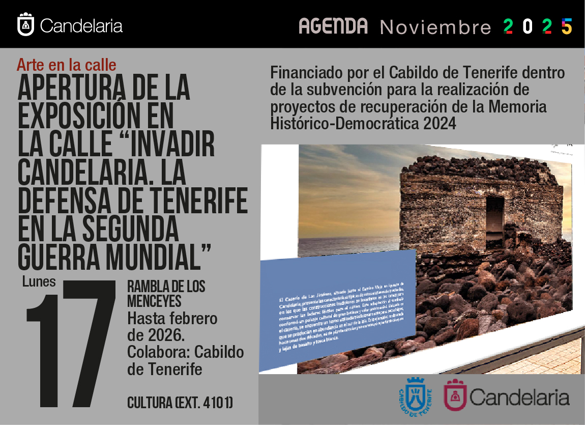 ✅ Exposición en la calle: Invadir Candelaria. La defensa de Tenerife en la Segunda Guerra Mundial 📍 Rambla de Los MenceyesHasta febrero 2026Colabora: Cabildo de Tenerife📞 Cultura Ext. 4101