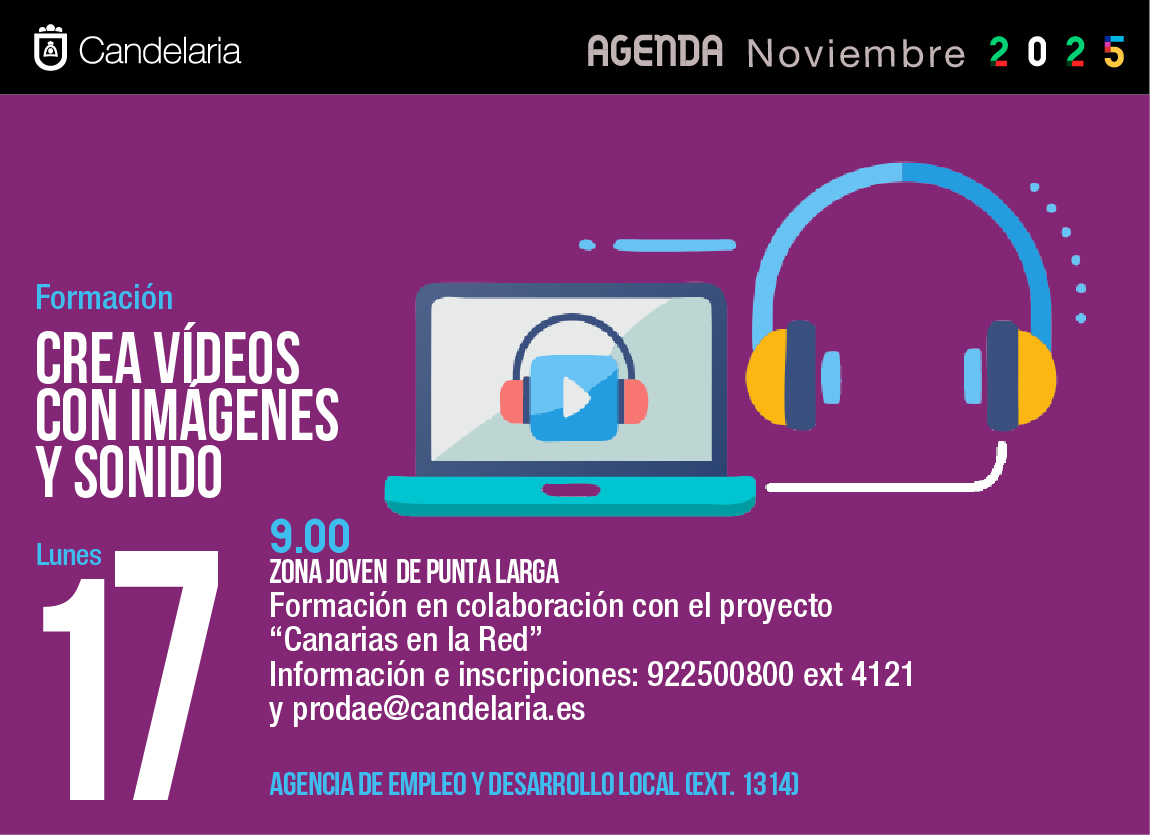 ✅ Formación: Crea vídeos con imágenes y sonido 🕒 9:00📍 Zona Joven Punta LargaProyecto Canarias en la Red📞 922 500 800 Ext. 4121 · prodae@candelaria.es📞 Agencia de Empleo y Desarrollo Local Ext. 1314