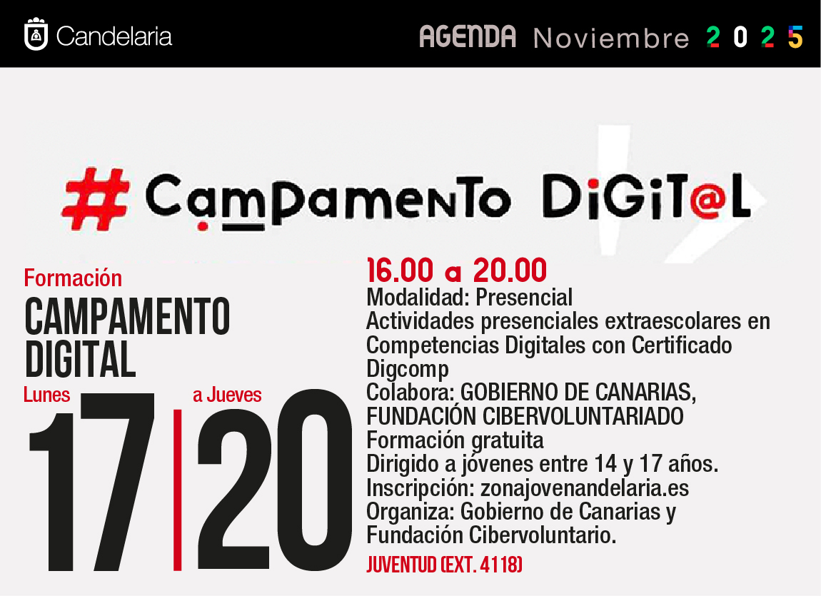 📌 Lunes 17 → Jueves 20 ✅ Campamento Digital 🕒 16:00–20:00📍 —Modalidad: PresencialActividades extraescolares en Competencias Digitales con certificado DigComp.Dirigido a jóvenes de 14 a 17 años.Inscripción: zonajoven@candelaria.esOrganizan: Gobierno de Canarias + Fundación Cibervoluntarios📞 Juventud Ext. 4118