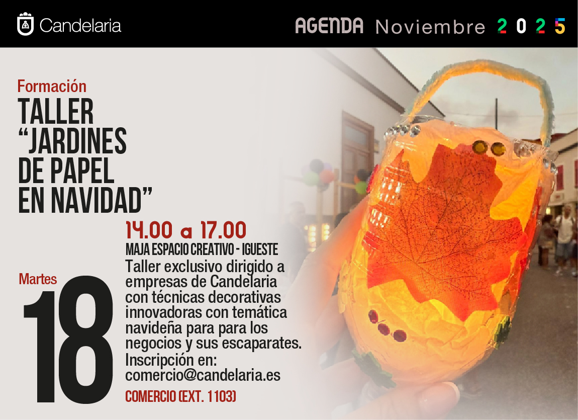 📌 Martes 18 ✅ Taller: “Jardines de papel en Navidad” 🕒 14:00–17:00📍 MAJA Espacio Creativo – IguesteTaller para empresas con técnicas decorativas navideñas para negocios y escaparates.Inscripción: comercio@candelaria.es📞 Comercio Ext. 1103