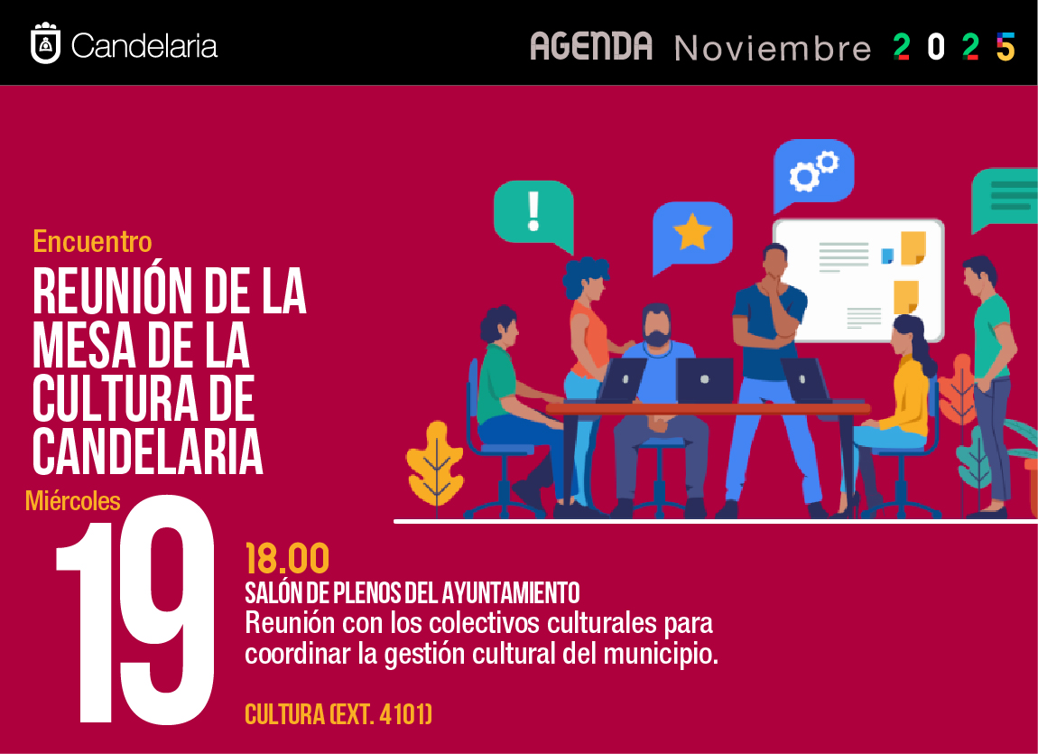 📌 Miércoles 19 ✅ Reunión de la Mesa de la Cultura de Candelaria 🕒 18:00📍 Salón de Plenos del AyuntamientoEncuentro con colectivos culturales para coordinar la gestión cultural del municipio.📞 Cultura Ext. 4101